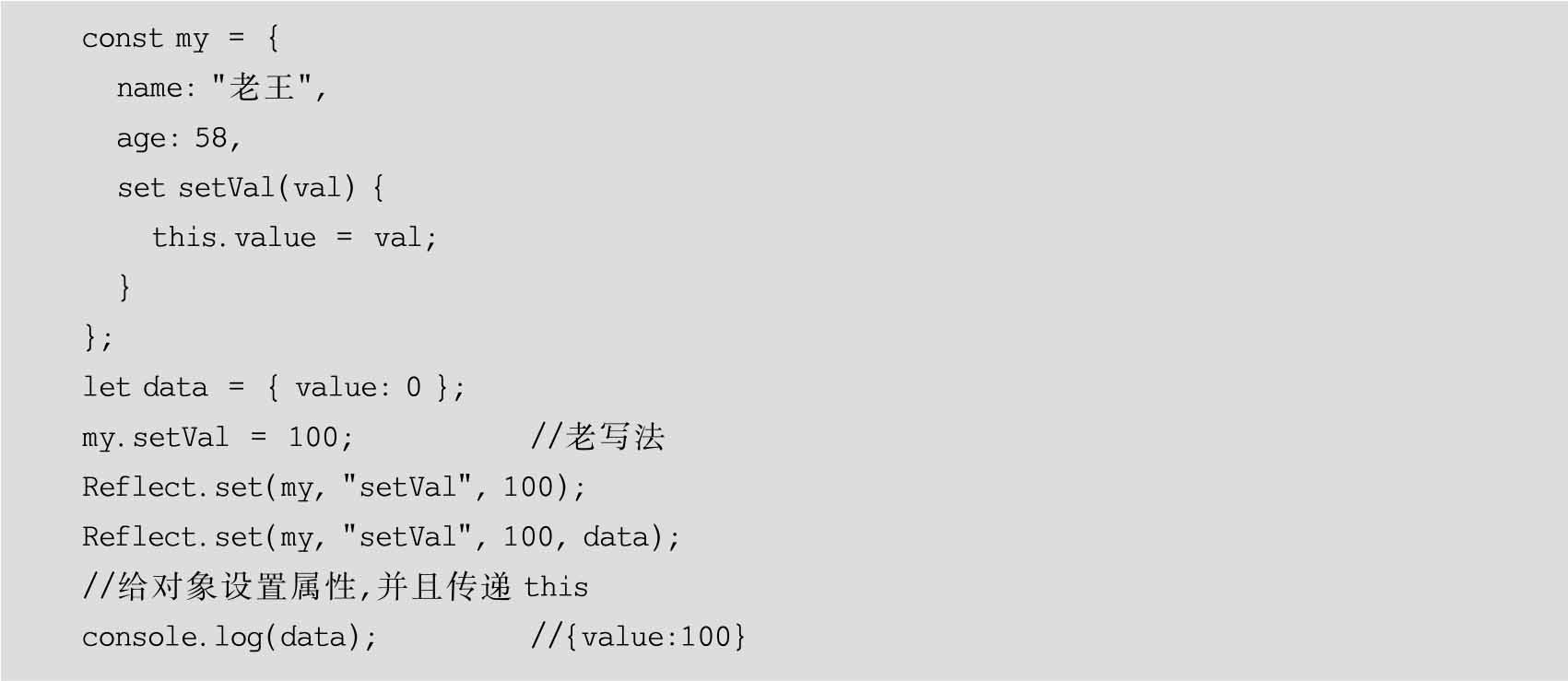 Reflect.set()函数用来设置对象中key对应的值,如代码示例2-129所示。