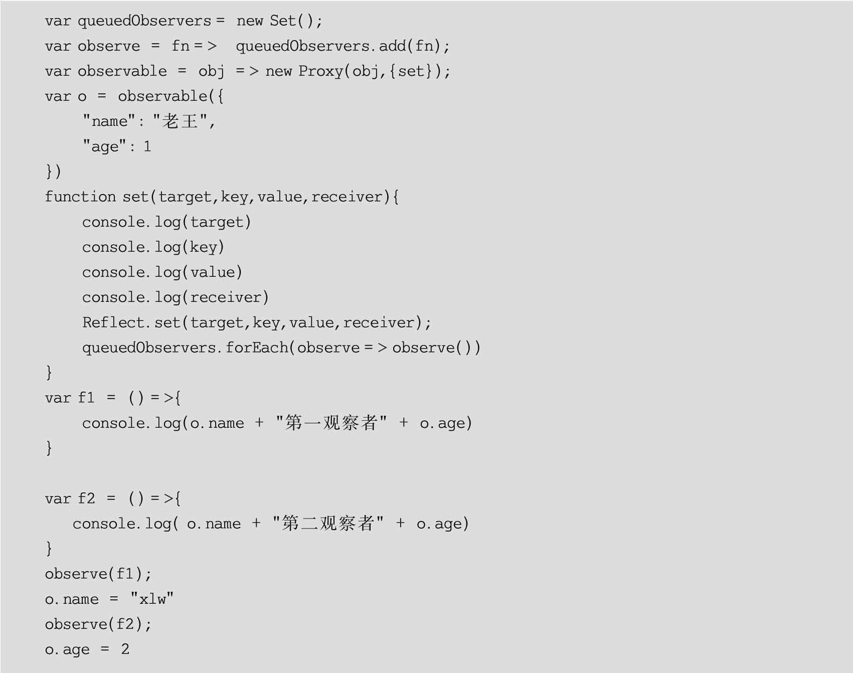 通过Reflect和Proxy组合实现观察者模式,如代码示例2-138所示。