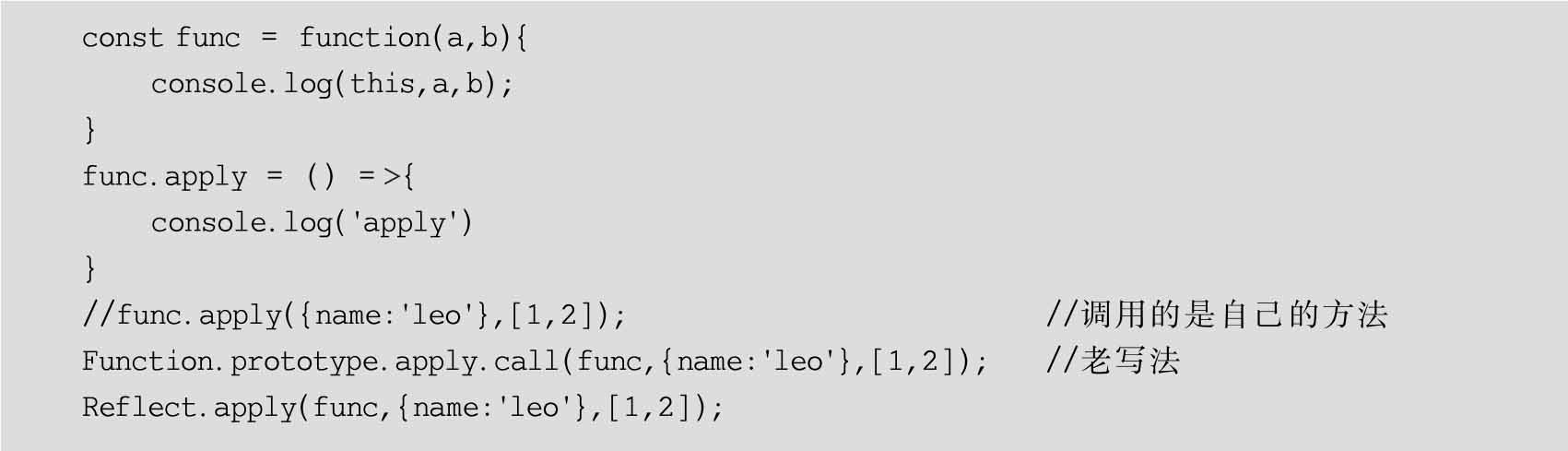 想必apply()方法大家都很了解了,Reflect.apply()等价于Function.prototype.apply.call(),如代码清单2-136所示。