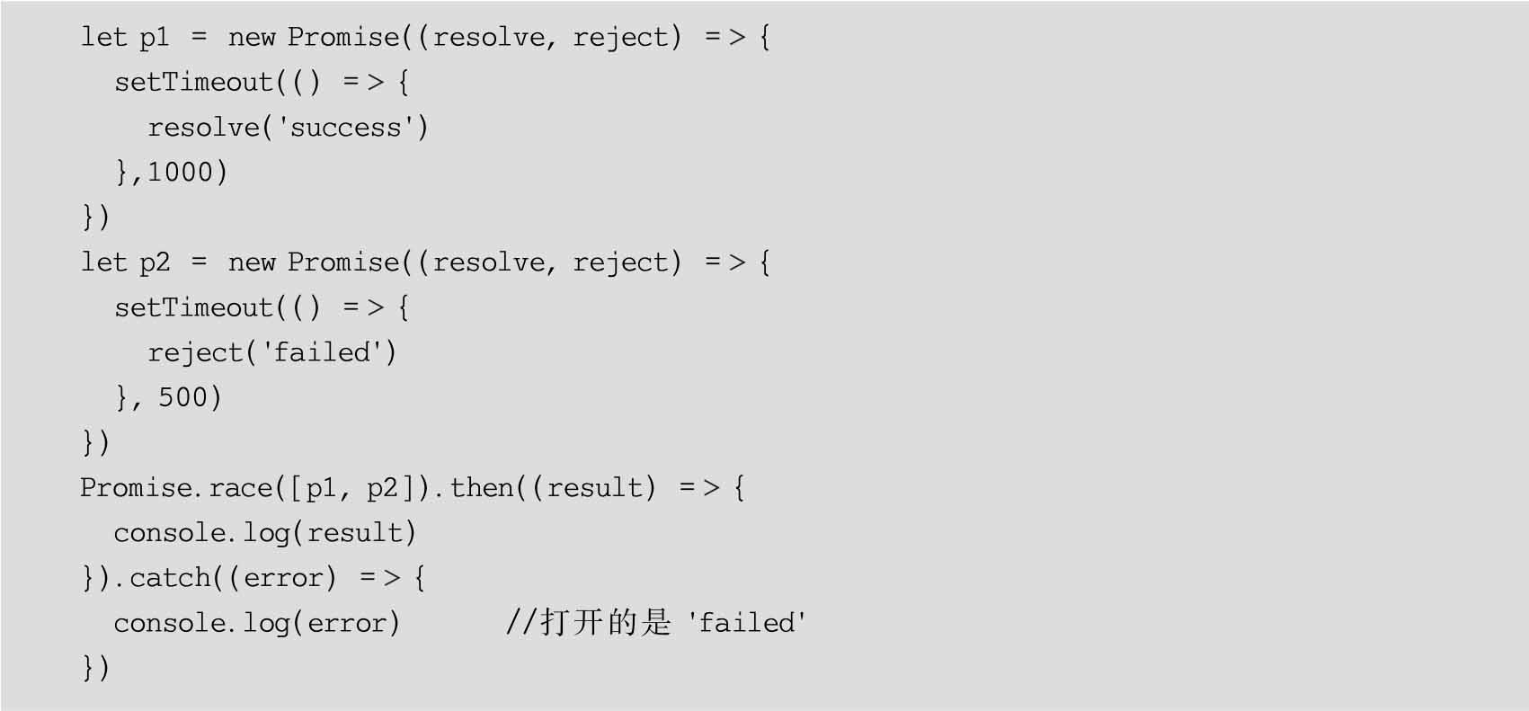 Promise.race是赛跑的意思,意思就是Promise.race([p1,p2,p3])里面哪个结果获得得快,就返回哪个结果,不管结果本身是成功状态还是失败状态,如代码示例2-144所示。