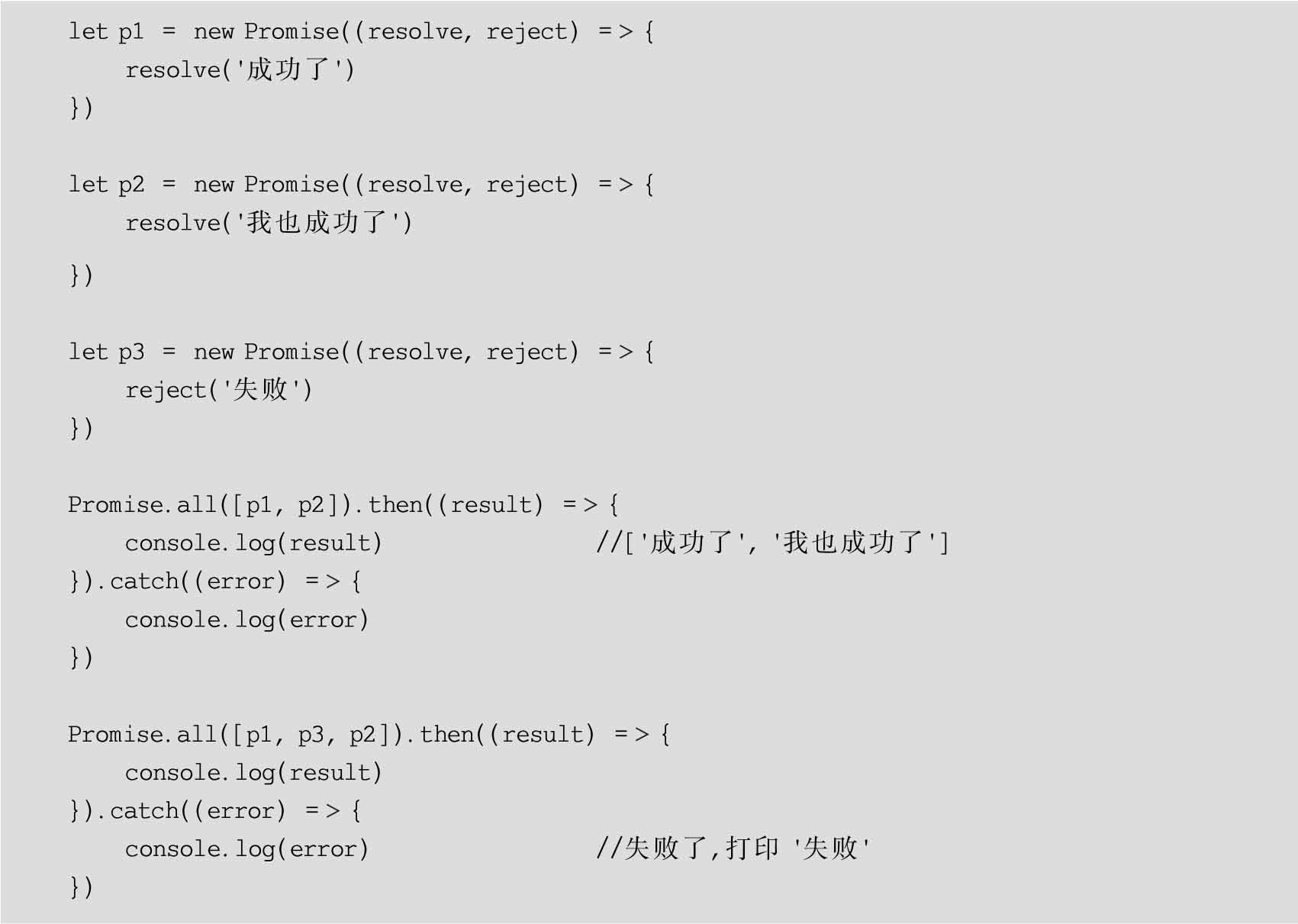 Promise.all可以将多个Promise实例包装成一个新的Promise实例。同时,成功和失败的返回值是不同的,成功的时候返回的是一个结果数组,而失败的时候则返回最先被reject方法处理的失败状态的值,如代码示例2-143所示。