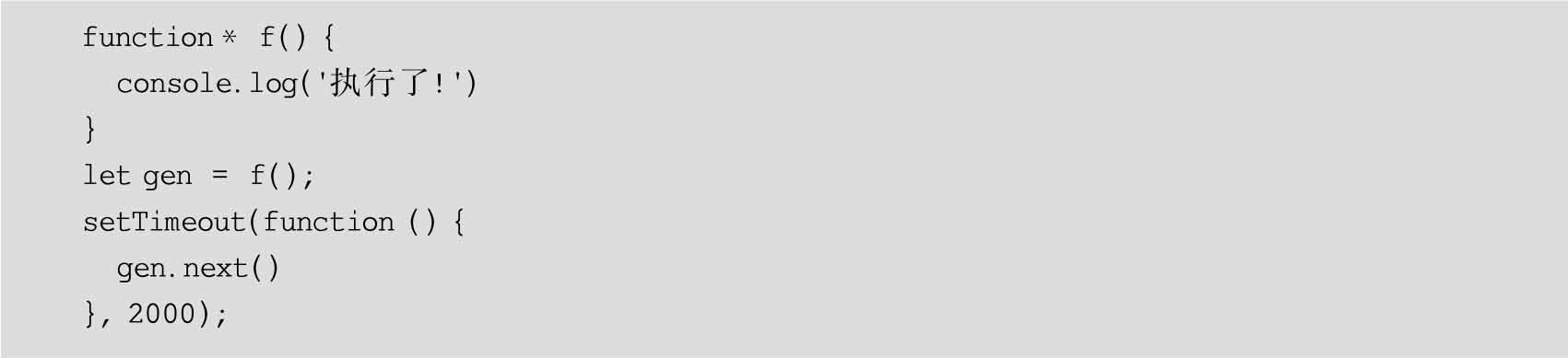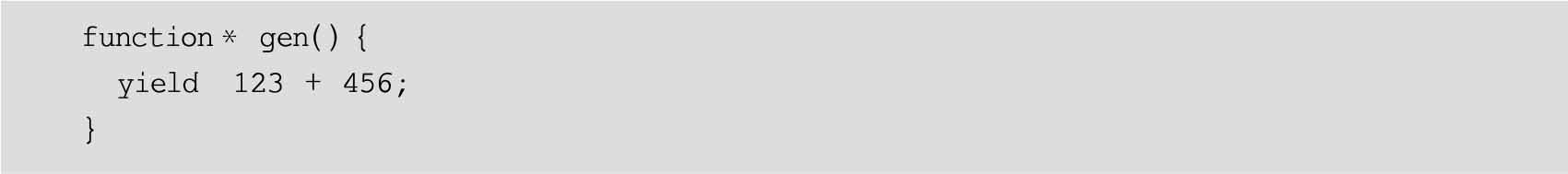 在代码示例2-146中,yield后面的表达式123+456不会立即求值,只会在next()方法将指针移到下一句时才会求值,如代码示例2-147所示。Generator()函数也可以不用yield语句,这时就变成了一个单纯的暂缓执行函数。