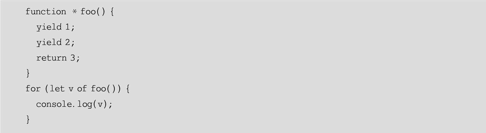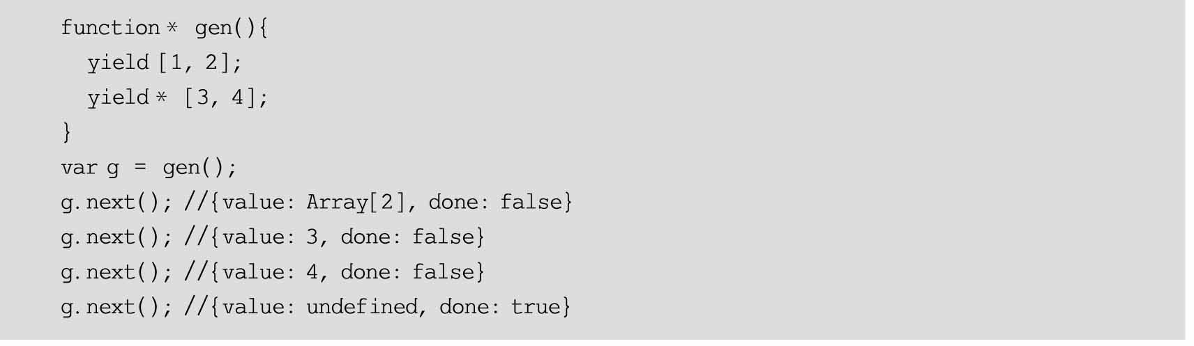 yield∗一个可迭代对象,相当于把这个可迭代对象的所有迭代值分次yield出去。表达式本身的值就是当前可迭代对象迭代完毕(当done为true时)时的返回值,如代码示例2-151所示。