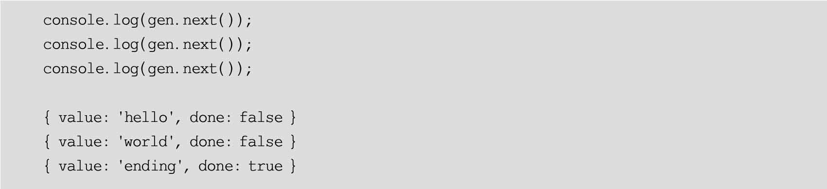 for…of循环可以自动遍历Generator()函数生成的Iterator对象,并且此时不再需要调用next()方法,如代码示例2-149所示。