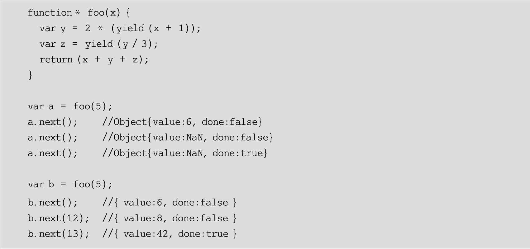 注意: yield句本身没有返回值(返回undefined)。next()方法可以带一个参数,该参数会被当作上一个yield语句的返回值,如代码示例2-148所示。