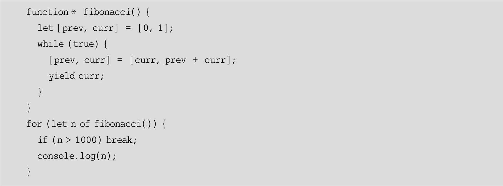 利用Generator()函数和for...of循环实现斐波那契数列,如代码示例2-150所示。