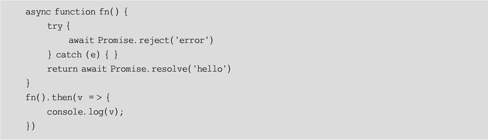 任何一个await语句后面的Promise对象变成reject状态,整个async()函数都会中断执行。如果希望前一个异步操作失败,则不要中断后面的异步操作,这时可以将await放在try...catch结构里,如代码示例2-156所示。
