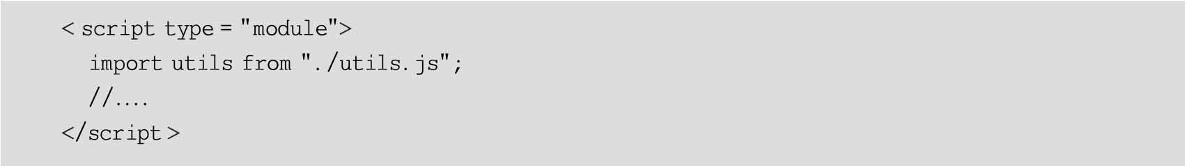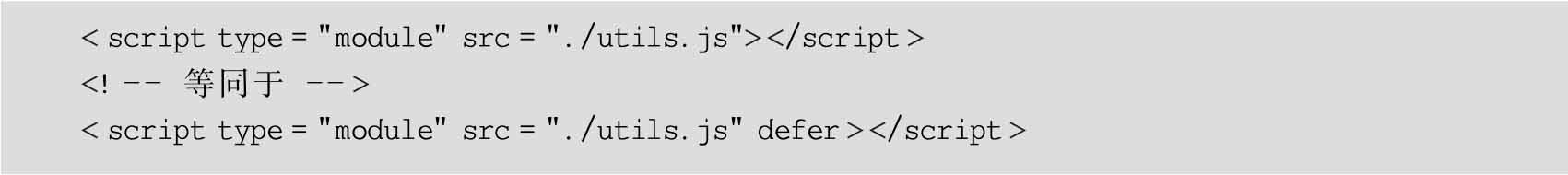 上面的代码用于在网页中插入一个模块utils.js,由于type属性被设为module,所以浏览器才可以识别出是ES 6模块。浏览器对于带有type=module的脚本采用异步加载,不会堵塞浏览器,即等到整个页面渲染完,再执行模块脚本,等同于打开了script标签的defer属性,代码如下: