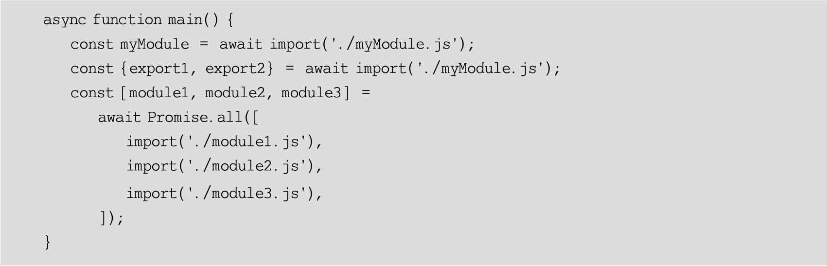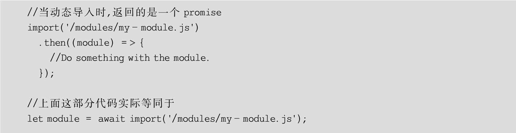 静态import在首次加载时会把全部模块资源下载下来,但是,在实际开发时,有时候需要动态导入(dynamic import),例如当单击某个选项卡时才去加载某些新的模块,这个动态导入的特性浏览器也是支持的,如代码示例2-181所示。
