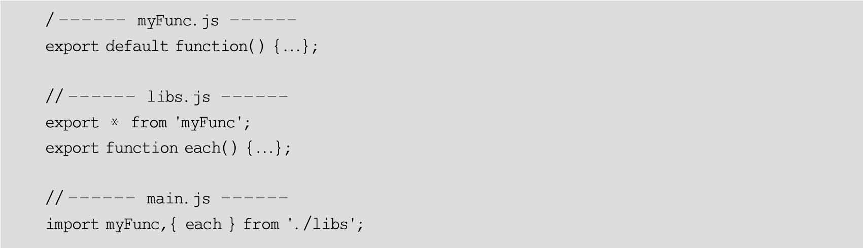 有时候为了避免上层模块导入太多的模块,可能使用底层模块作为中转,直接导出另一个模块的内容,如代码示例2-175所示。