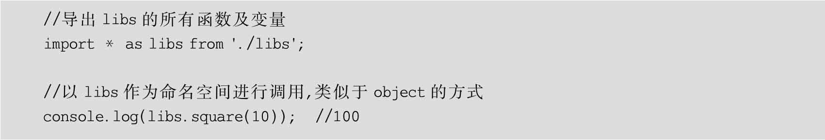 当export有多个函数或变量时,如导出多个内容,可以使用∗as关键字来导出所有函数及变量,同时as后面跟着的名称作为该模块的命名空间,如代码示例2-177所示。