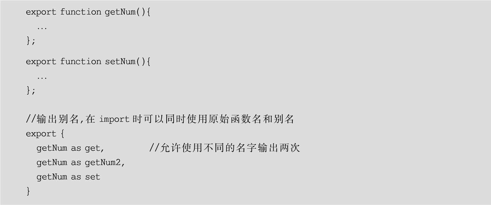 一般情况下,export输出的变量就是在原文件中定义的名字,但也可以用as关键字来指定别名,这样做一般是为了简化或者语义化export的函数名,如代码示例2-174所示。