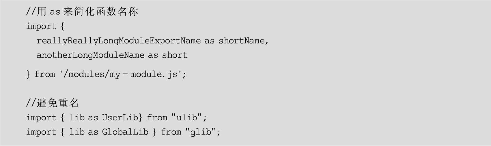 和export一样,也可以用as关键字设置别名,当导入的两个类的名字一样时,可以使用as来重设导入模块的名字,也可以用as来简化名称。如代码示例2-179所示。