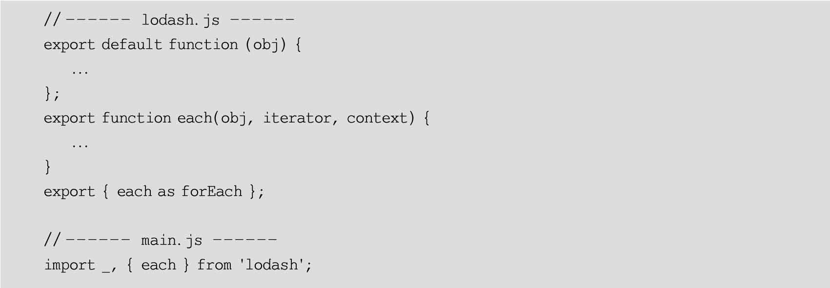 混合导出,也就是前面介绍的第1种和第2种方式结合在一起的情况。例如Lodash之类的库采用这种组合方式,如代码示例2-172所示。