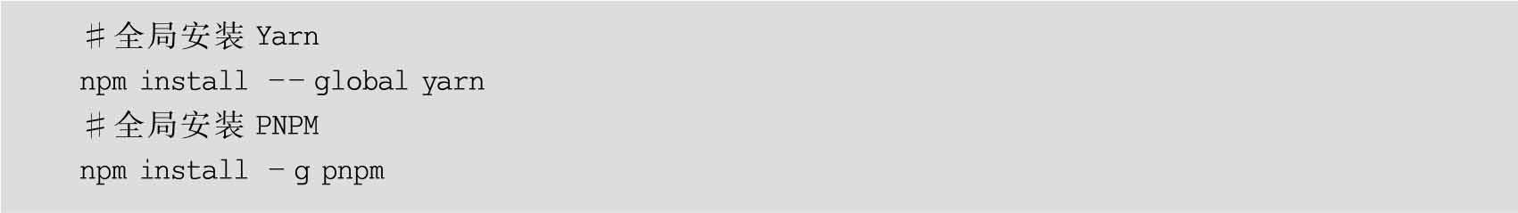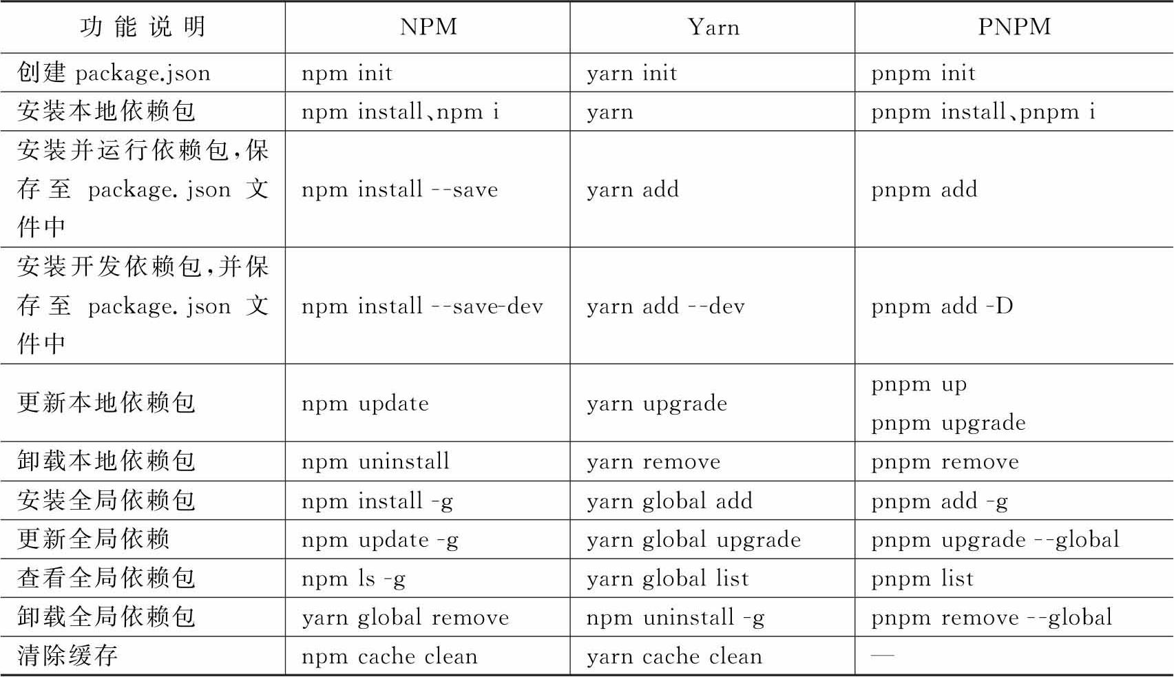 NPM、Yarn、PNPM的操作命令差别不大,具体可以参考表3-1。
