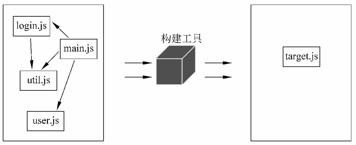 开发环境和线上环境面临的情况有较大差异,因此需要一个工具能够让开发者专心地书写开发环境的代码,然后利用这个工具将开发时编写的所有代码转化为运行时所需要的资源文件。这样的工具称为构建工具,如图3-1所示。