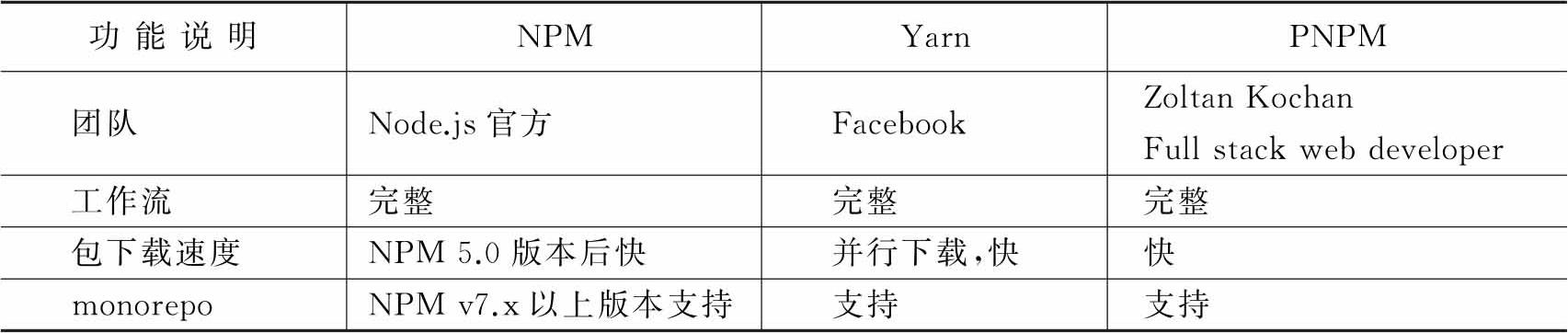 如何选择合适的包管理器,表3-2列举了部分内容的对比情况,供大家选择。