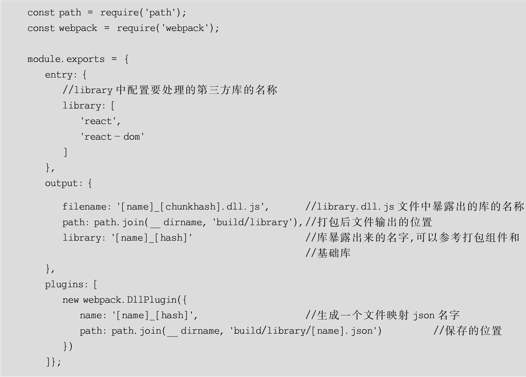 DLLPlugin插件在一个额外独立的Webpack设置中创建一个只有dll的bundle,也就是说,在项目根目录下除了有webpack.config.js文件,还会新建一个webpack.dll.config.js文件。webpack.dll.config.js的作用是除了把所有的第三方库依赖打包到一个bundle的dll文件里面,还会生成一个名为manifest.json的文件。该manifest.json文件的作用是让DllReferencePlugin映射到相关的依赖上去。