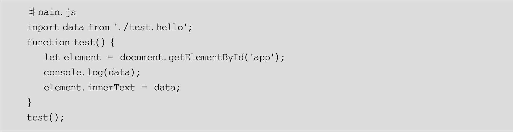 第3步:编写main.js打包入口代码。main.js是打包的入口文件,因为要尽可能简单,所以这个文件只做一件事,即加载.hello文件,并显示到页面,代码如下: