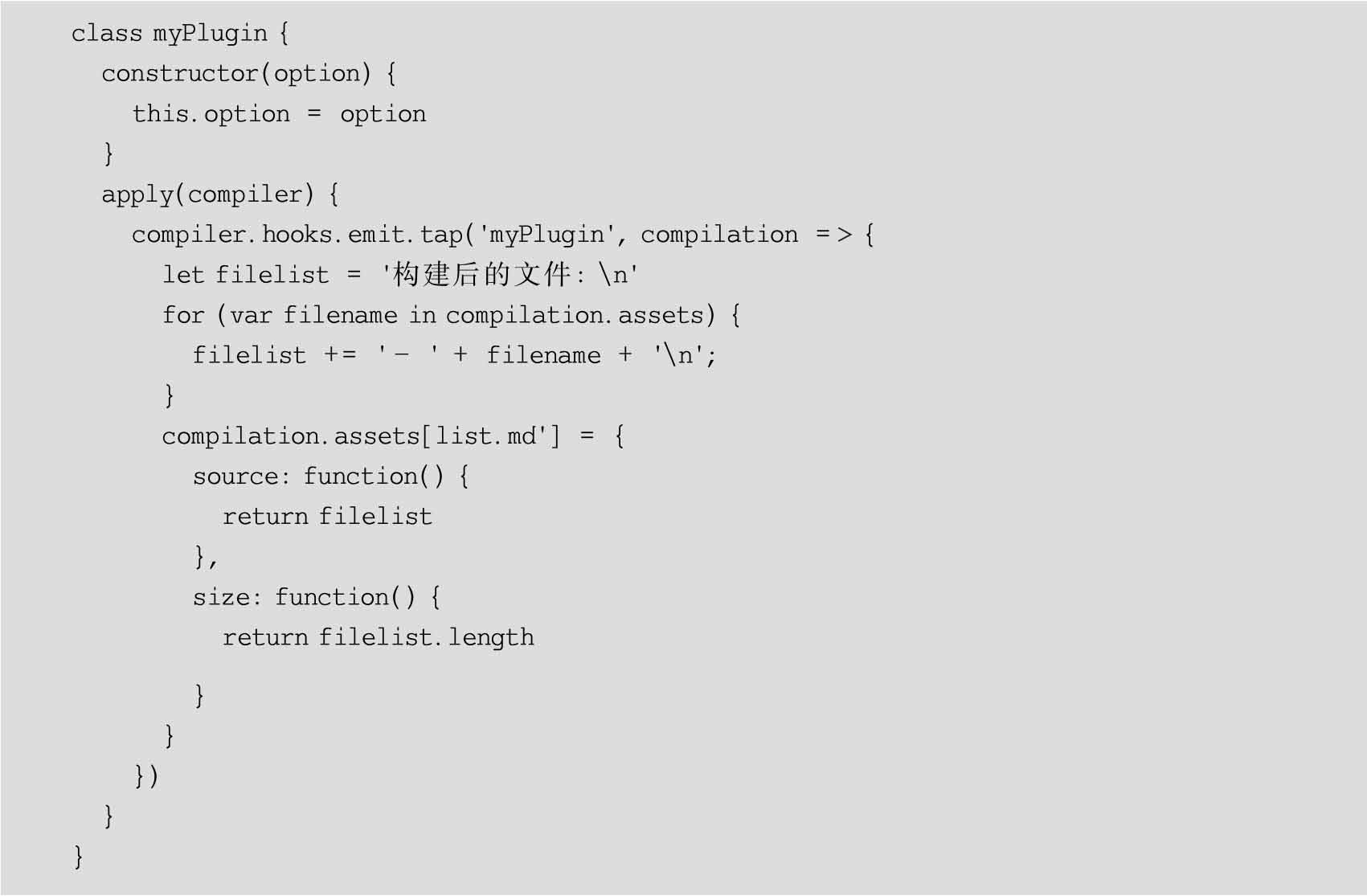 (2)编写一个输出所有打包目录文件列表的插件,这个插件在构建完相关的文件后,会输出一个记录所有构建文件名的list.md文件,代码如下: