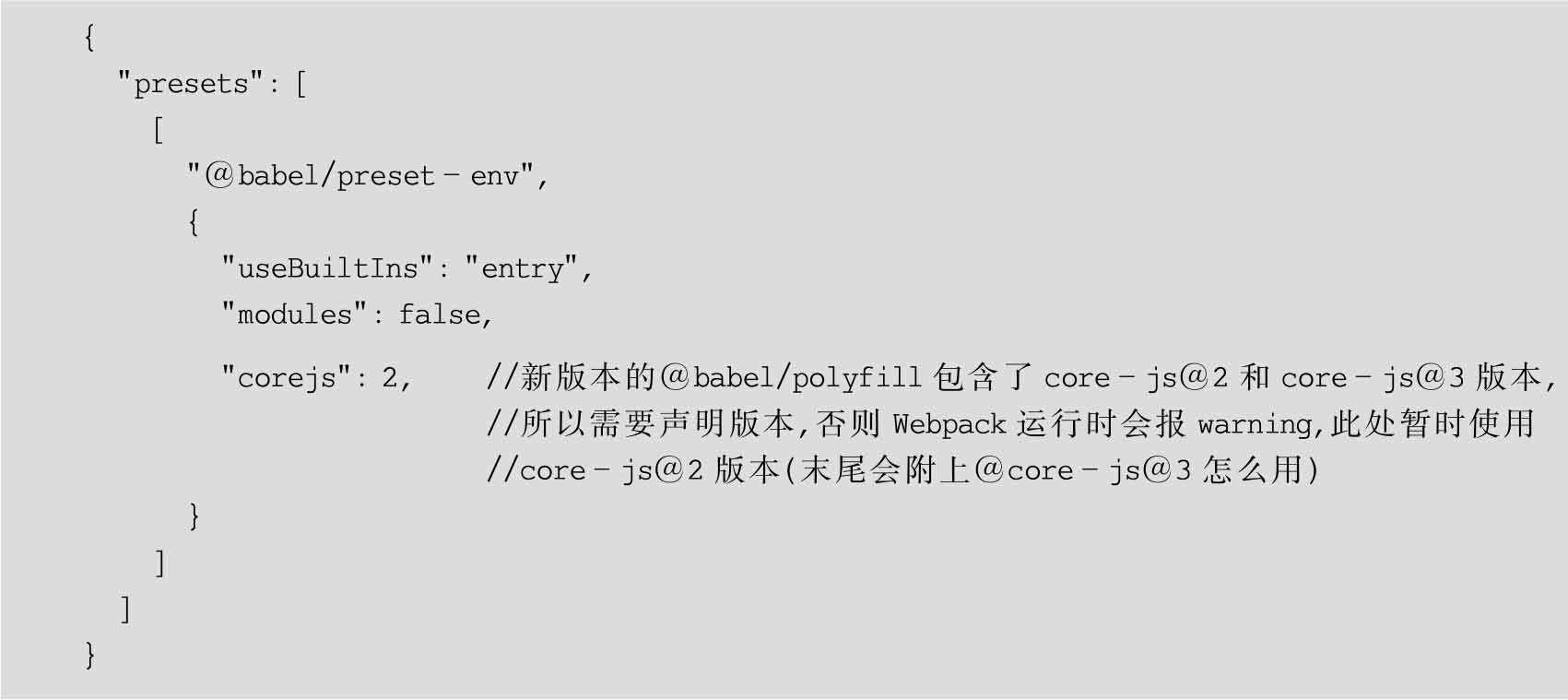 .babelrc文件需写入配置,而@babel/polyfill不用写入配置,会根据useBuiltIns参数去决定如何被调用,配置如下: