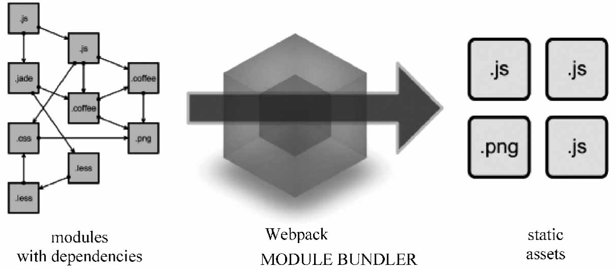 Webpack的工作方式是把项目当作一个整体,通过一个给定的主文件(如index.js),Webpack将从这个主文件开始找到项目的所有依赖文件,使用Loader处理它们,最后打包为一个(或多个)浏览器可识别的JavaScript文件,如图3-8所示。