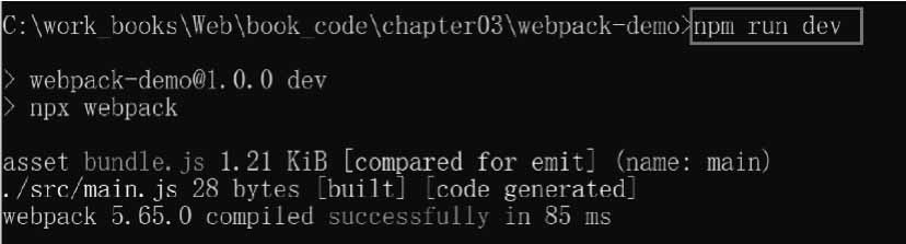 第5步:编译并运行。在项目目录下直接执行webpack命令,如图3-20所示,打包的文件输出在dist目录下。
