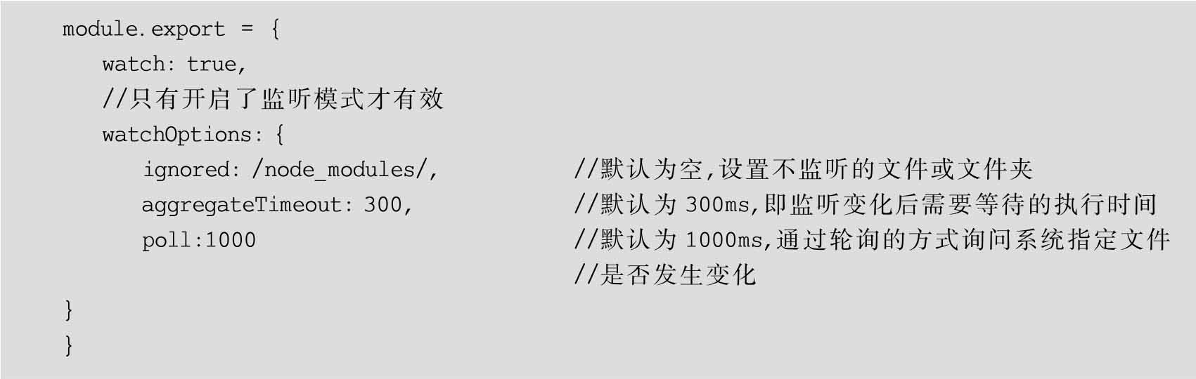 除了可通过watch参数的配置方式开启监听外,也可通过定制watch模式选项的形式watchOptions来定制监听配置,配置如下: