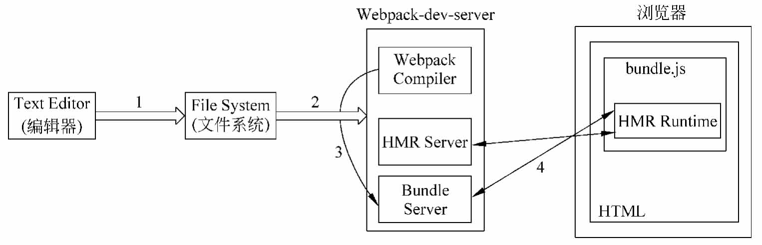 当启动Webpack-dev-server阶段时,将源码在文件系统进行编译,通过Webpack Compiler编译器打包,并将编译好的文件提交给Bundle Server服务器,Bundle Server即可以服务器的方式供浏览器访问。