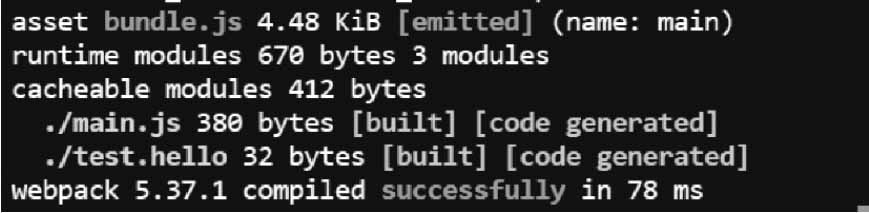 执行构建,Webpack会等待一秒,然后输出构建内容,通过Node.js执行构建后的文件,输出如下: