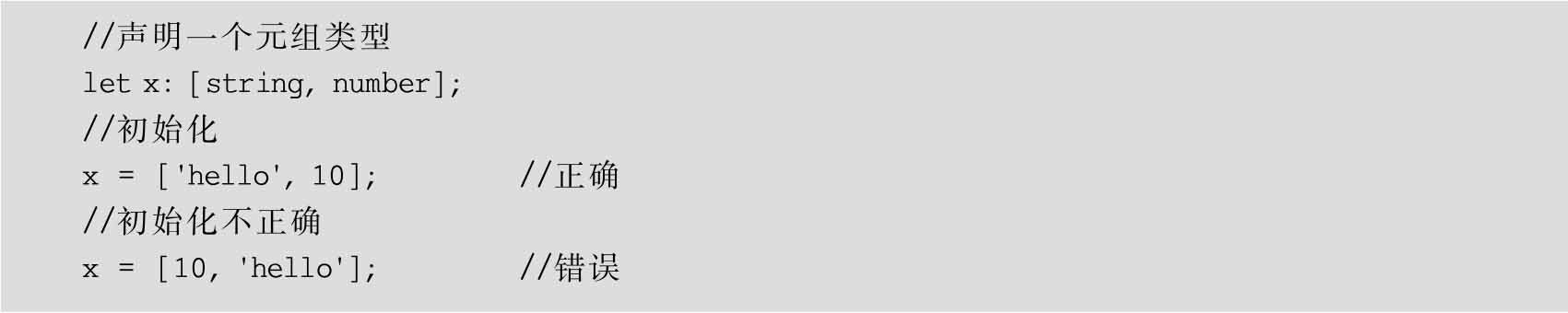 元组类型允许表示一个已知元素数量和类型的数组,各元素的类型不必相同。例如,可以定义一对值分别为string和number类型的元组,如代码示例4-8所示。