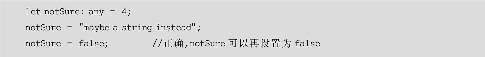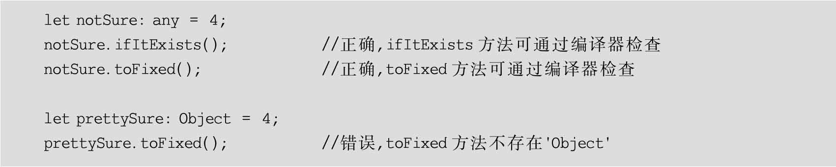 有时需要为那些在编程阶段还不清楚类型的变量指定一种类型。这些值可能来自于动态的内容,例如来自用户输入或第三方代码库。这种情况下,不希望类型检查器对这些值进行检查而是直接让它们通过编译阶段的检查,此时可以使用any类型来标记这些变量,如代码示例4-15所示。