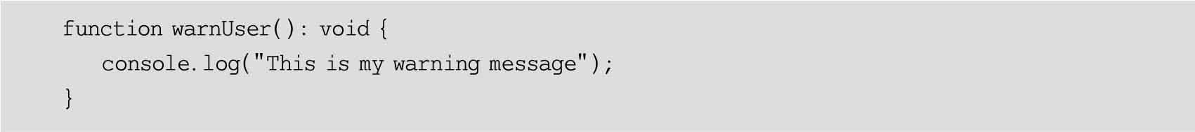 某种程度上来讲,void类型像是与any类型相反,它表示没有任何类型。当一个函数没有返回值时,通常会见到其返回值的类型是void,如代码示例4-18所示。