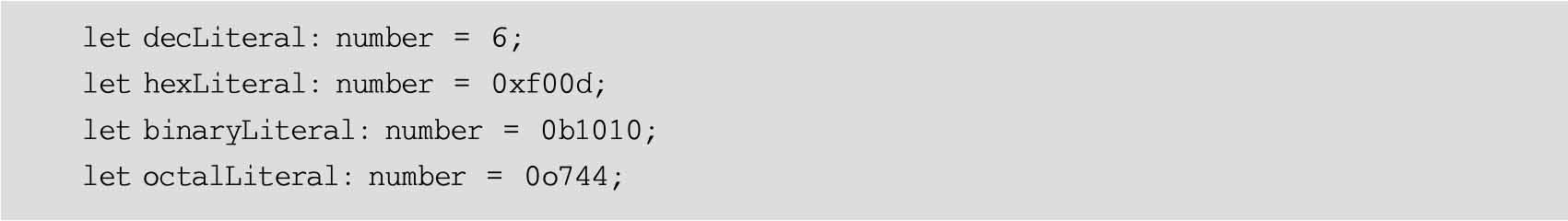 和JavaScript一样,TypeScript里的所有数字都是浮点数。这些浮点数的类型是number。除了支持十进制和十六进制字面量外,TypeScript还支持ECMAScript 2015中引入的二进制和八进制字面量,如代码示例4-2所示。