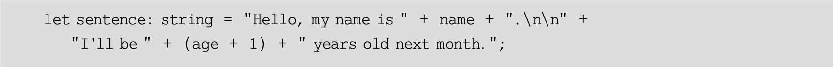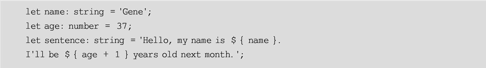 还可以使用模板字符串,它可以定义多行文本和内嵌表达式。这种字符串是被反引号包围“`”的,并且以${expr}这种形式嵌入表达式,如代码示例4-4所示。
