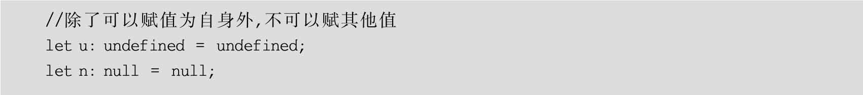 在TypeScript里,undefined和null两者各自有自己的类型,分别叫作undefined和null。和void相似,它们本身的类型用处不是很大,如代码示例4-20所示。