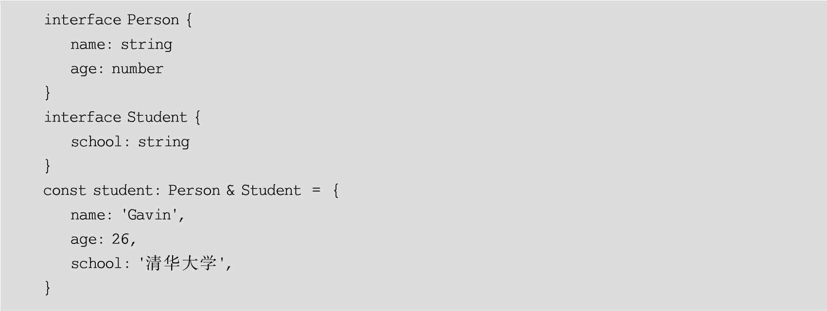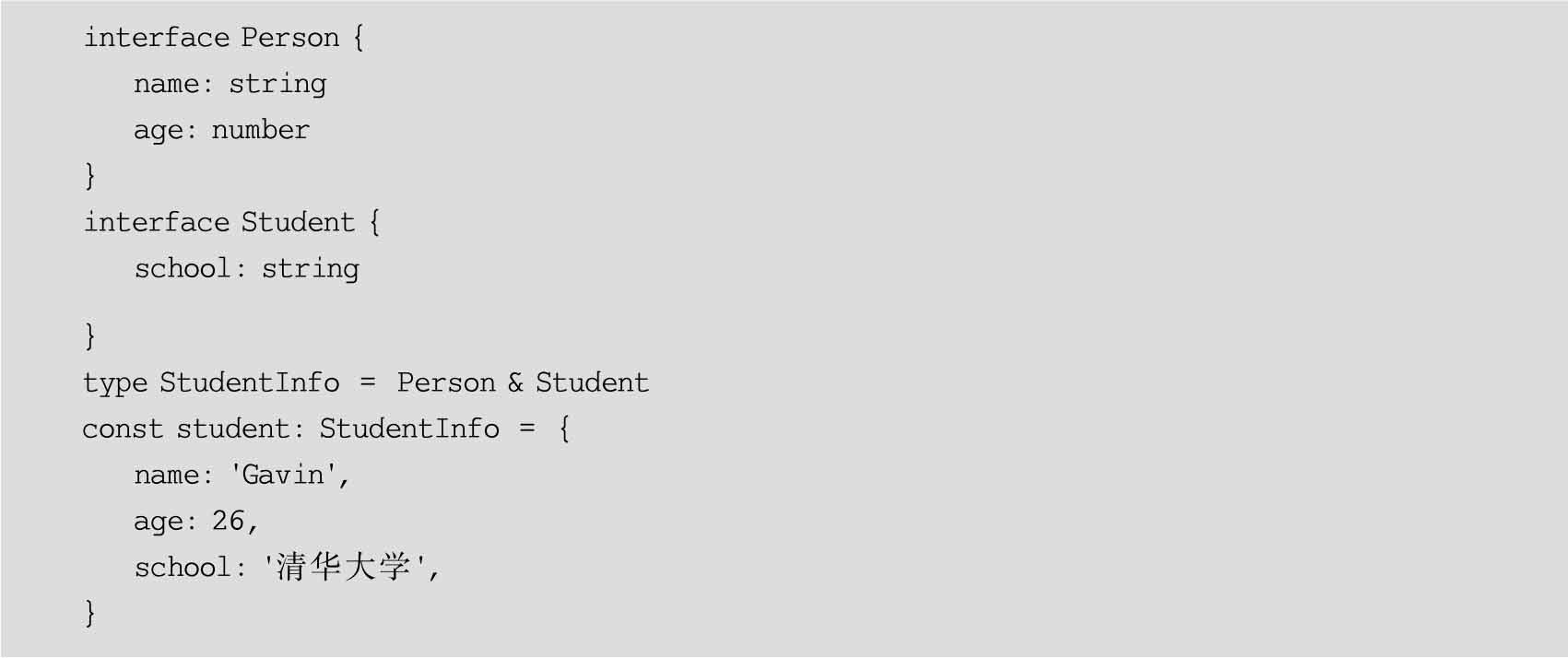 下面定义了两种类型:Person和Student,变量student的类型是Person和Student的交叉类型,student的类型必须满足两种类型的交叉组合体要求,如代码示例4-25所示。