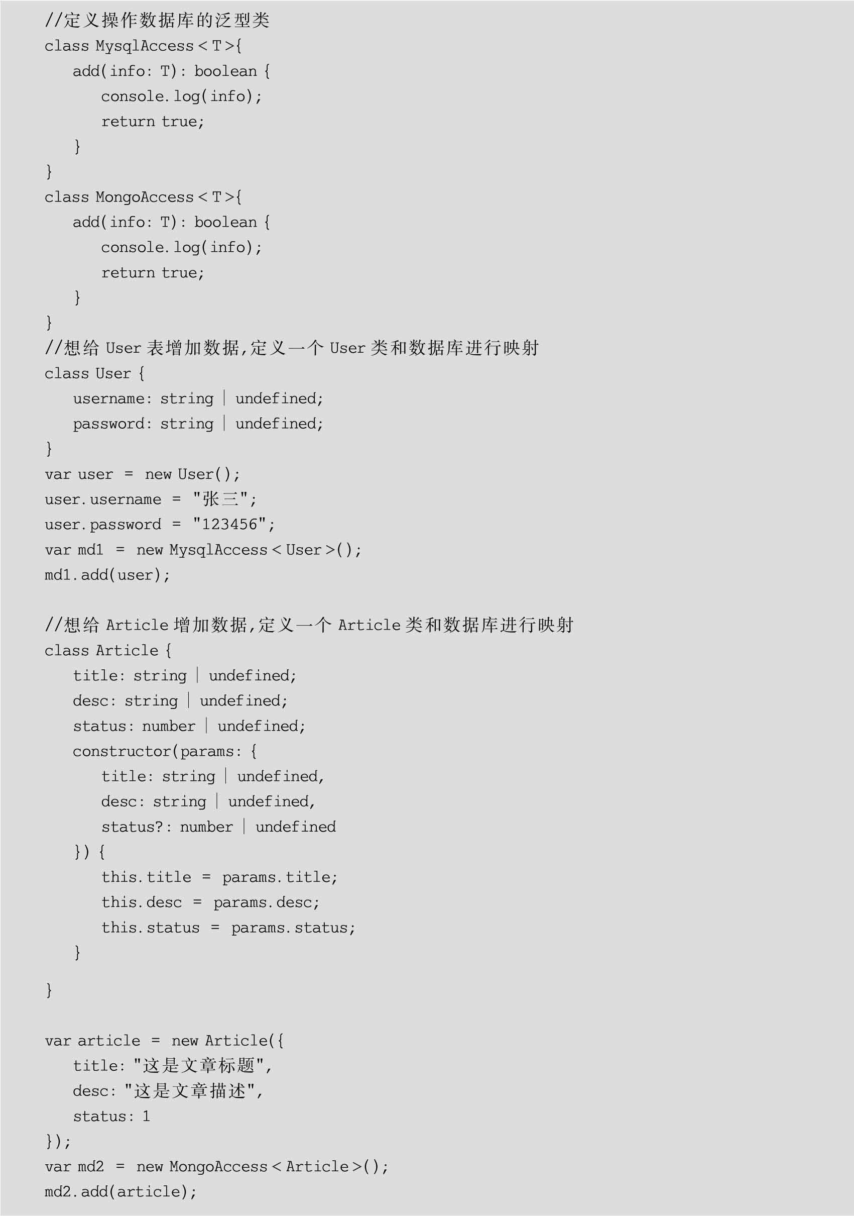 通过泛型类可以定义一个操作数据库的库,支持MySQL、MS-SQL、MongoDB,要求MySQL、MS-SQL、MongoDB功能一样,都有add、update、delete、get方法,如代码示例4-24所示。