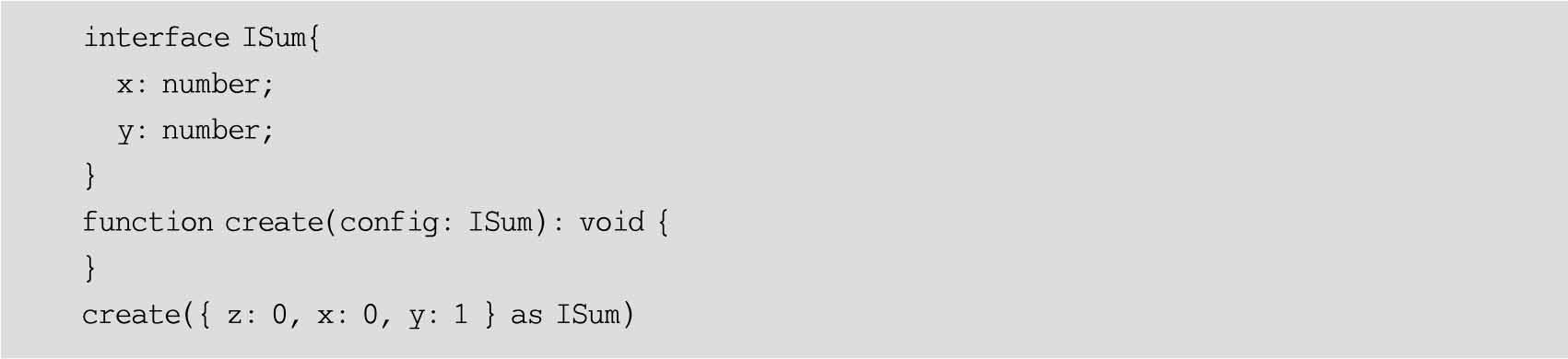 在JavaScript中这段代码并不会有错,因为对于对象当传进一个未知的属性时并不是错误,虽然可能会引发潜在的Bug,但在TypeScript中这个错误是非常明显的,编译器并不会通过编译,除非显式地使用类型断言。