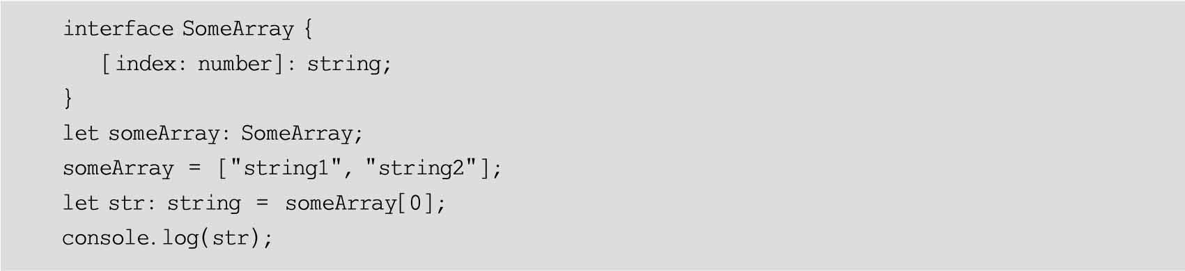 索引类型具有一个索引签名,它描述了对象索引的类型,还有相应的索引返回值类型,如代码示例4-40所示。