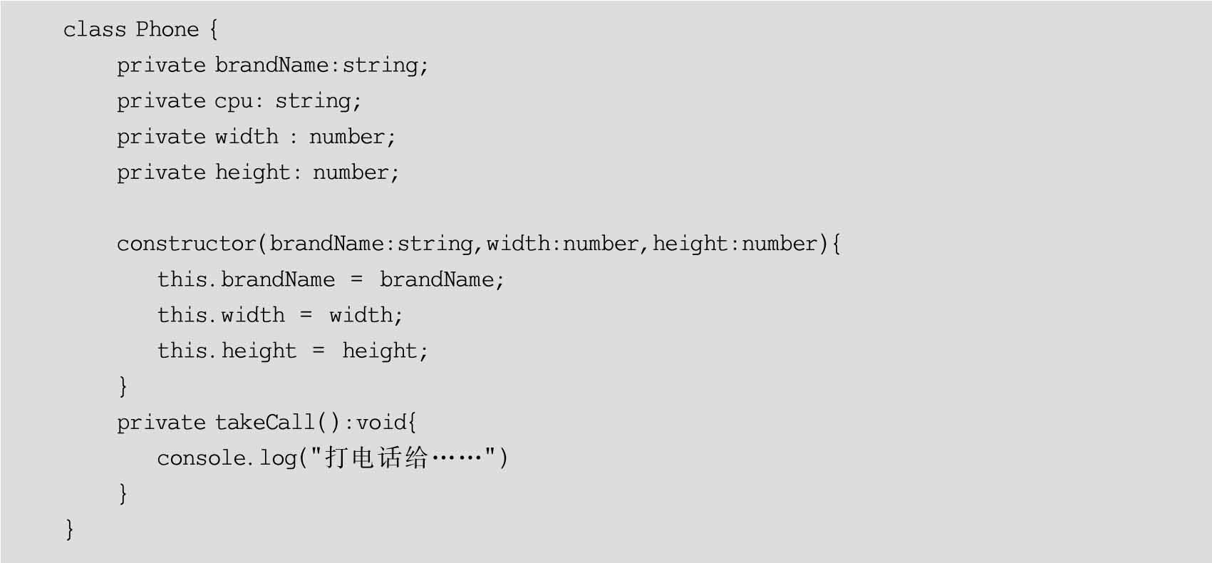 TypeScript定义类的方式和ES6定义类的方式是一样的,在下面代码中的属性和方法前面比ES6的类多了一个访问修饰符private,这里表示该属性和方法是私有的,如代码示例4-29所示。