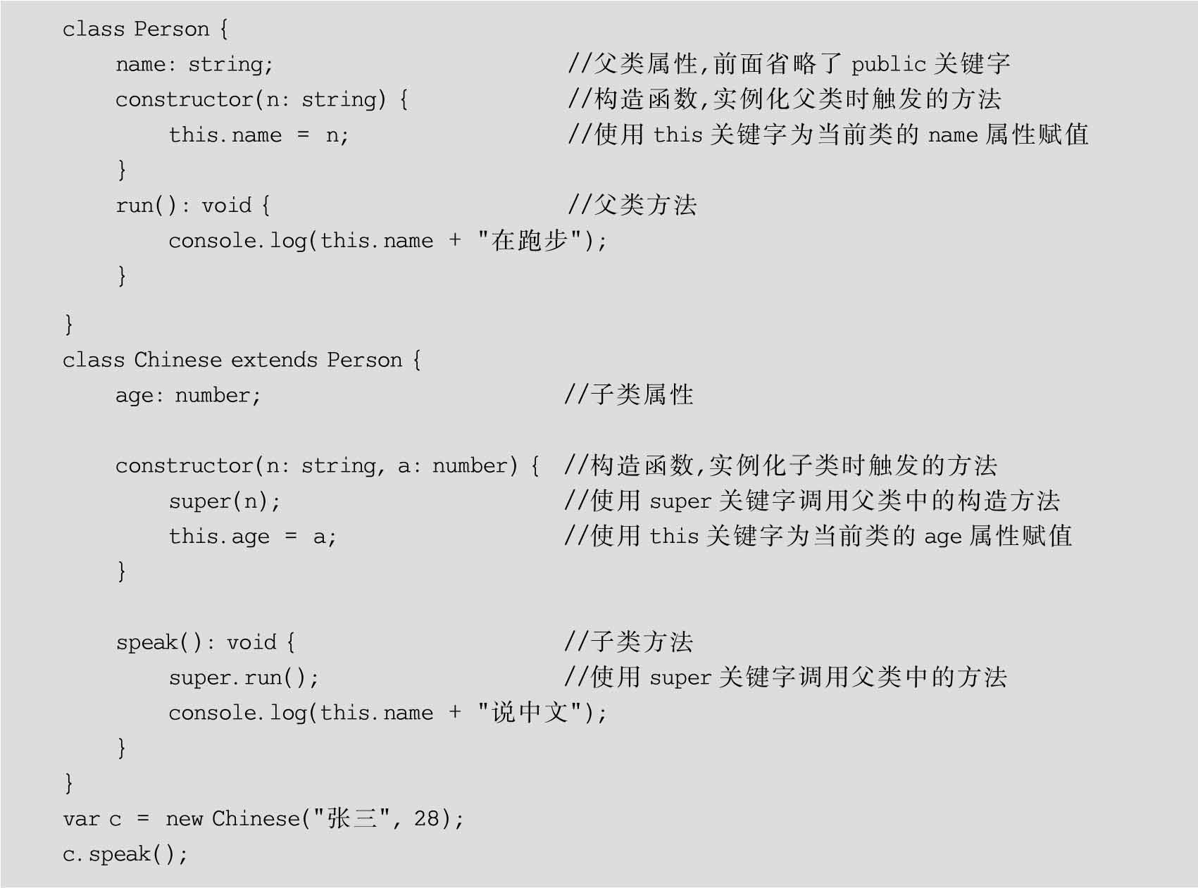 在TypeScript中实现继承时可使用extends关键字,一旦实现了继承关系,子类中就拥有了父类的属性和方法,而在执行方法过程中,首先从子类开始查找,如果有,就使用,如果没有,就去父类中查找。类的继承只能单向继承,如代码示例4-31所示。