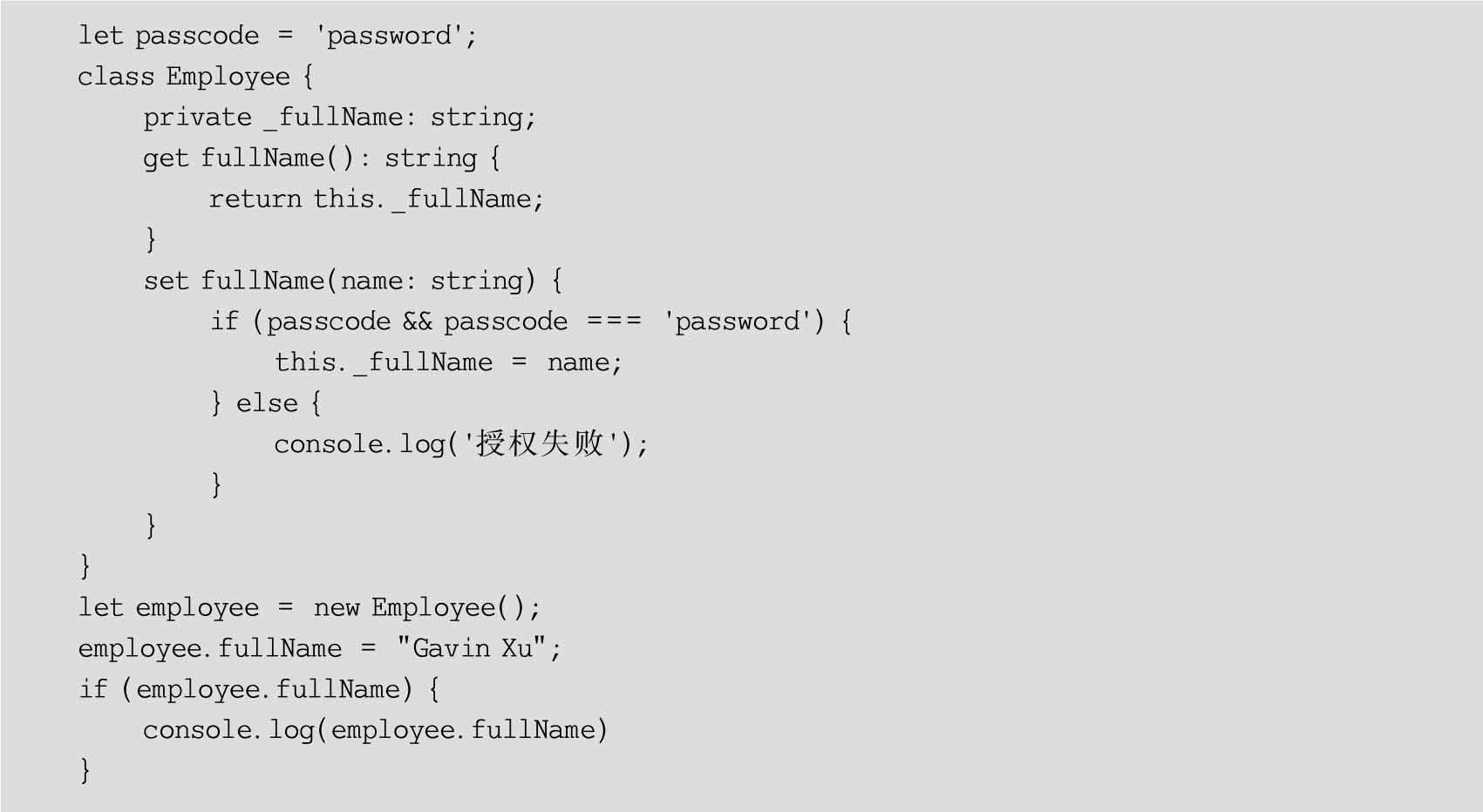 TypeScript支持通过getters/setters来截取对对象成员的访问。它能帮助开发者有效地控制对对象成员的访问。在下面的例子中对成员变量fullName的访问是通过存储器访问的,可以在set()方法中添加与权限相关的逻辑来控制对内部成员变量的操作,如代码示例4-30所示。