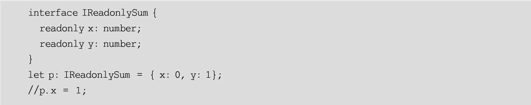 接口中的属性可以添加只读标记readonly,添加只读属性后,表示该属性不可以再赋值了,如代码示例4-36所示。