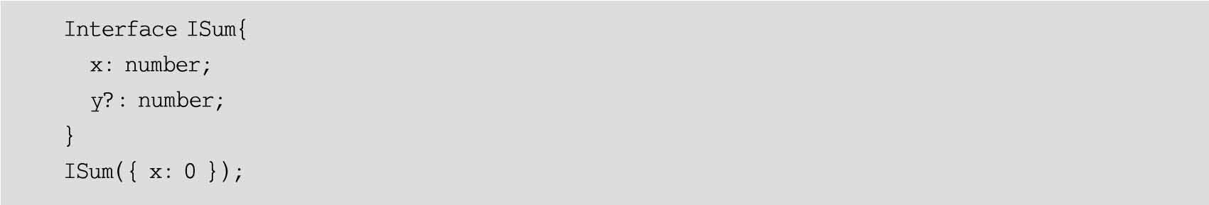 接口中的属性或者方法可以标记为可选实现的,和C#中的可选属性一致,在一个属性后面跟着一个问号(?),标记这个属性为可选的,如代码示例4-35所示。