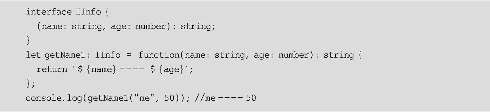 为了使用接口表示函数类型,需要给接口定义一个调用签名。它就像是一个只有参数列表和返回值类型的函数定义。参数列表里的每个参数都需要名字和类型,如代码示例4-39所示。