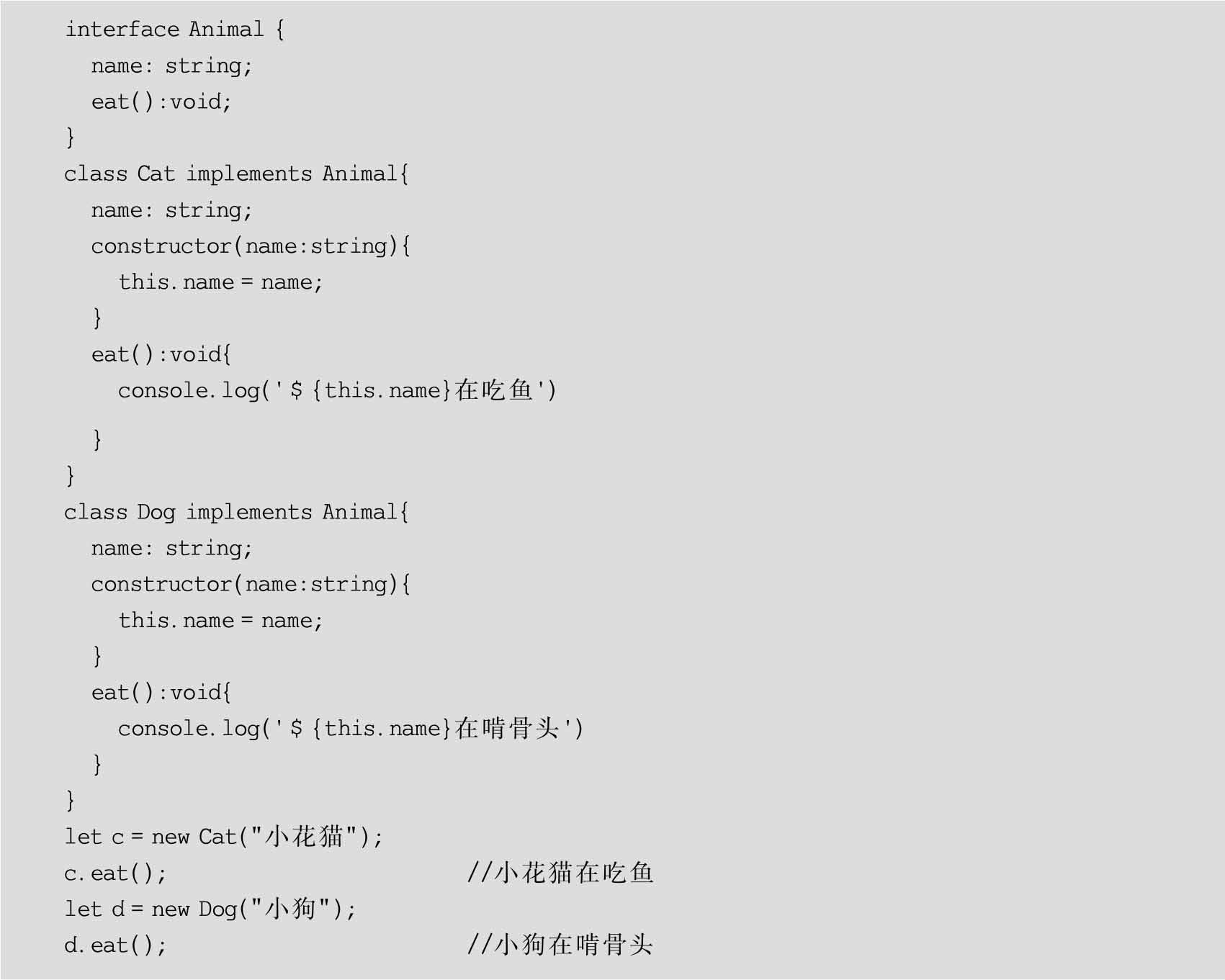 与Java或C#中的接口规则一致,TypeScript能够实现类实现来明确地强制一个类去符合某种契约,如代码示例4-41所示。