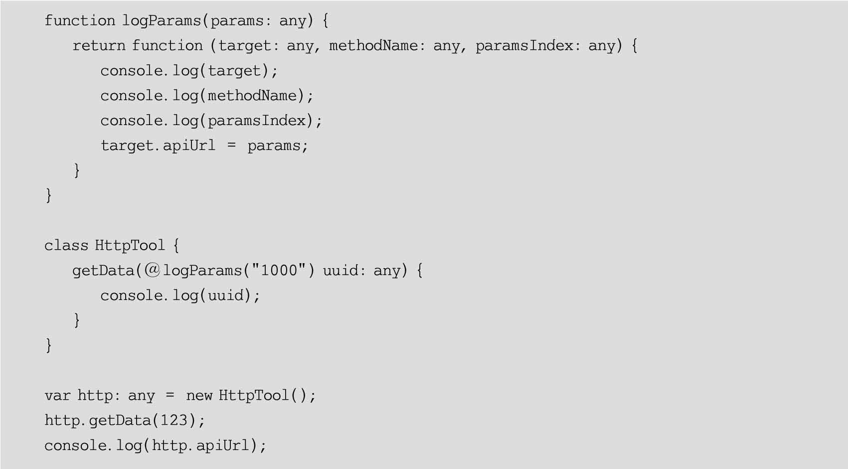 参数装饰器表达式会在运行时当作函数被调用,可以使用参数装饰器为类的原型增加一些元素数据,传入下列3个参数: