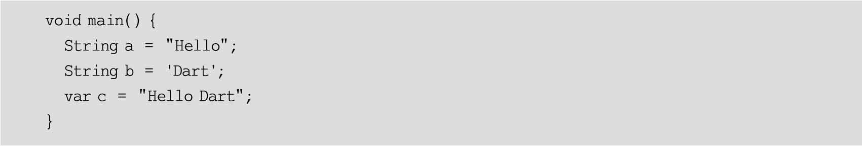 字符串代表了一系列的字符。Dart字符串是一系列UTF-16代码单元。Dart中的字符串变量使用String修饰定义。单引号或双引号包裹的字符组合表示字符串字面量,如代码示例5-7所示。