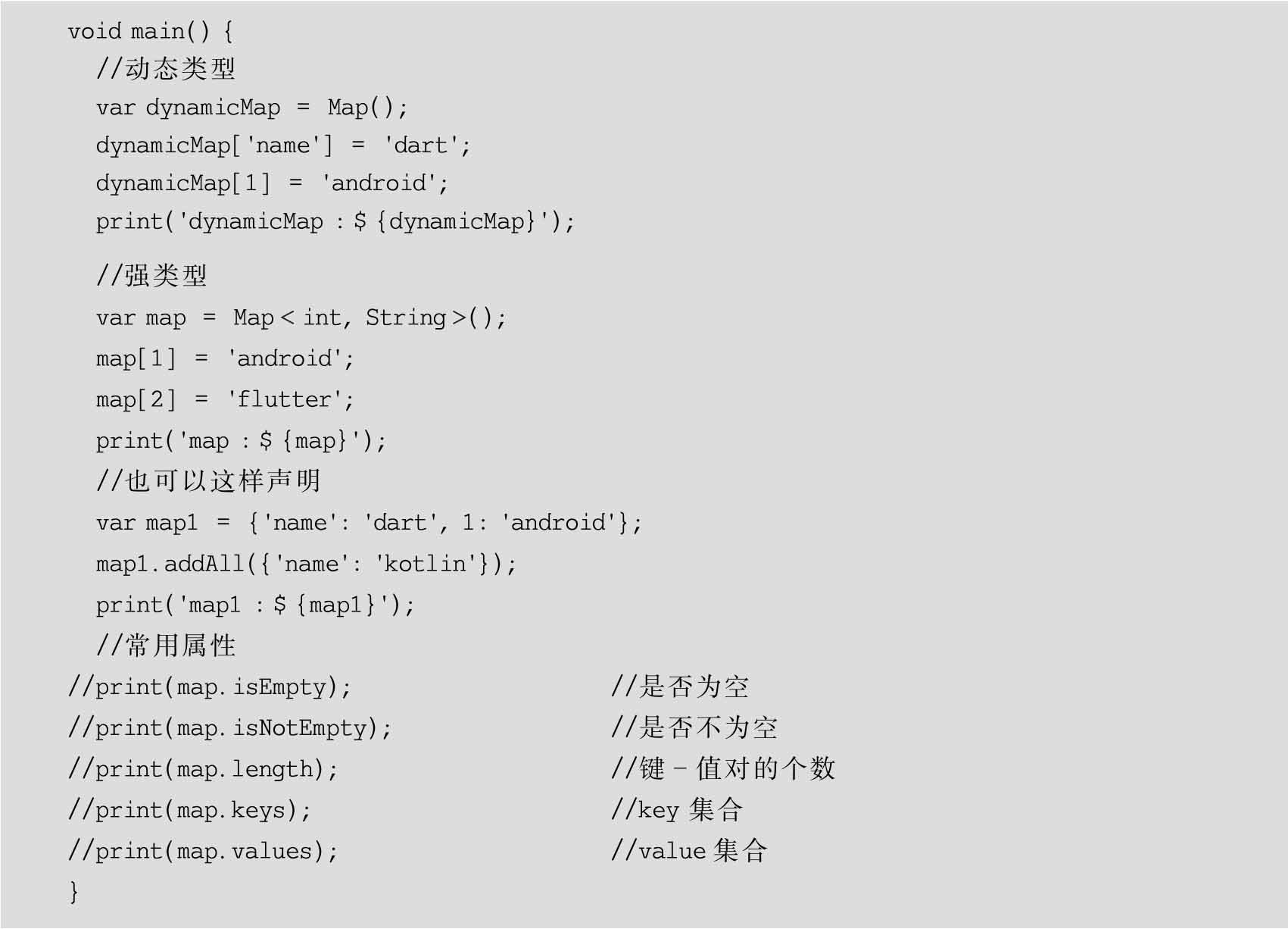Dart语言中的映射类型相当于Python中的字典类型,其中的元素都是以键-值对的形式存在的,映射的创建如代码示例5-11所示。
